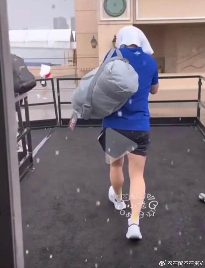 国乒下训的时候,雨还下得很大,队员们不得不冒雨从训练馆跑出来,有网友拍到了孙颖莎直接将浴巾往头上一盖,大步就往前跑。