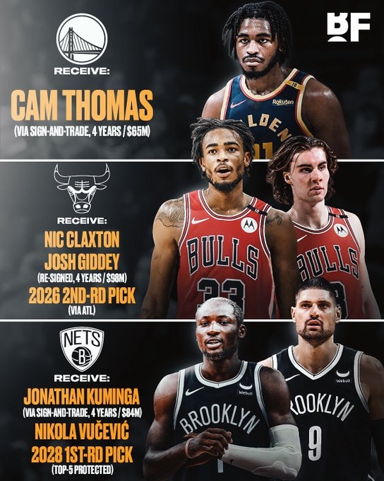 篮网得到:库明加(4年8400万,先签后换)+武切维奇+2028年的来自公牛的首轮签(前5保护)